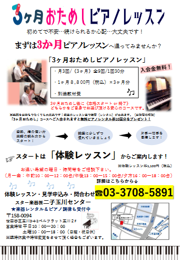 ☆二子玉川センター〈3ヵ月おためしピアノレッスン♪〉