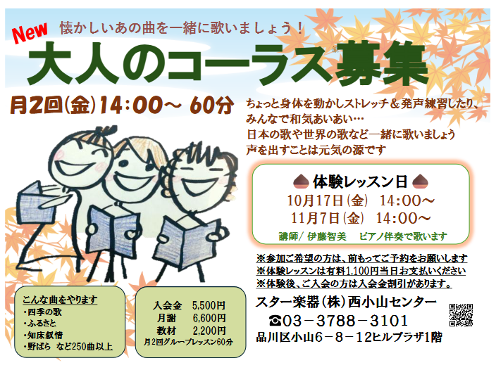 スター楽器西小山センターでは11月より大人のコーラスを開講いたします。