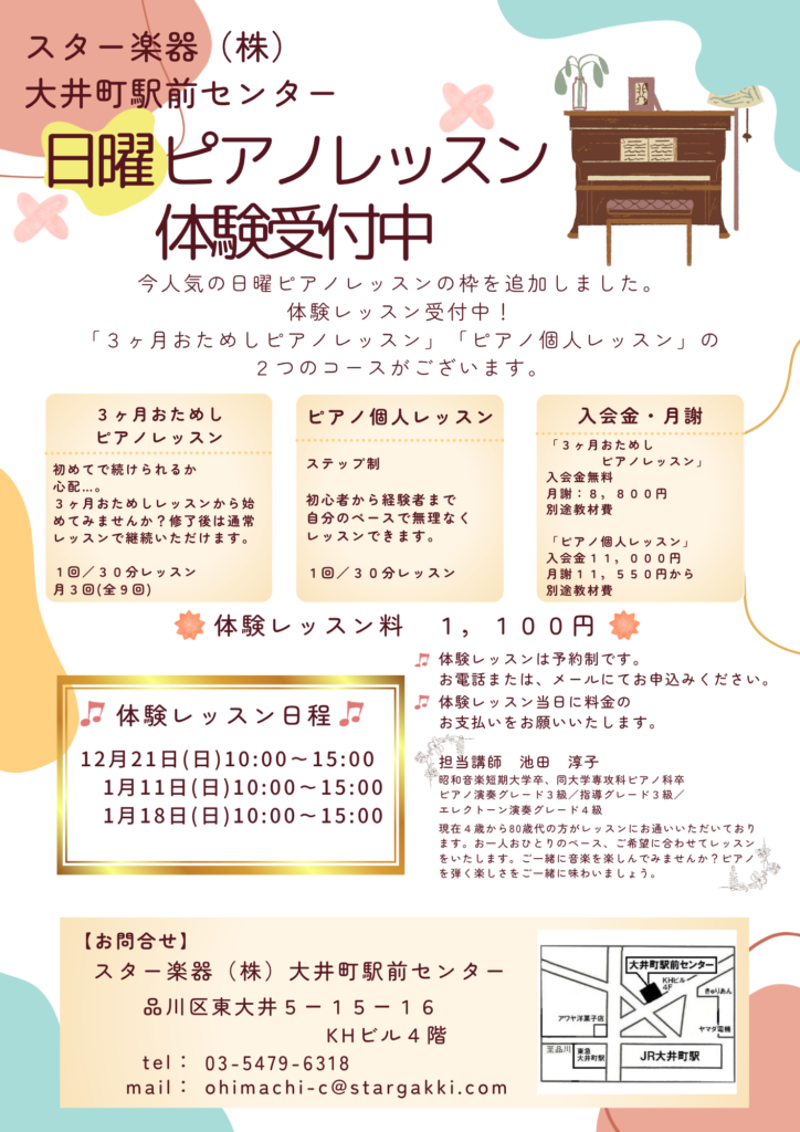 スター楽器大井町駅前センターより2月開講、日曜日ピアノレッスンのご案内です。